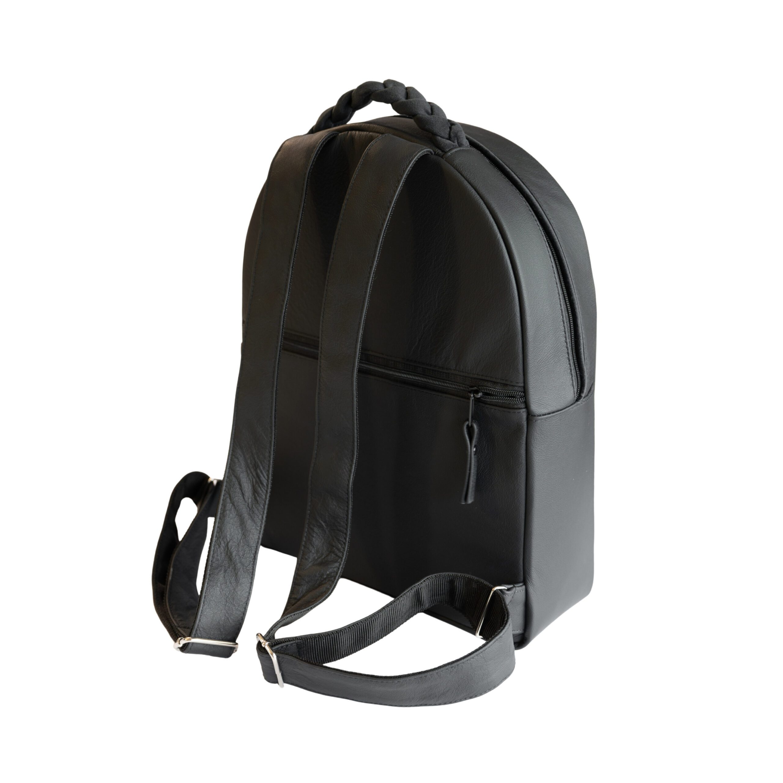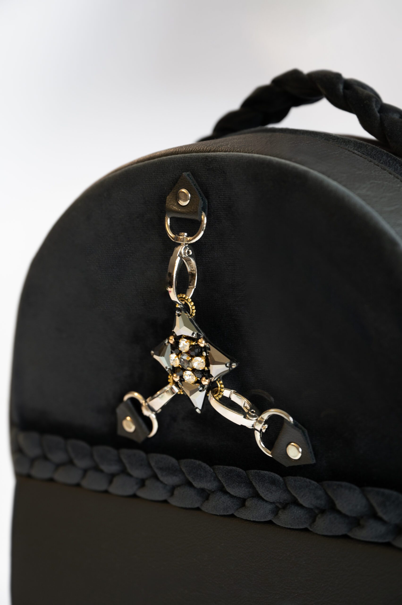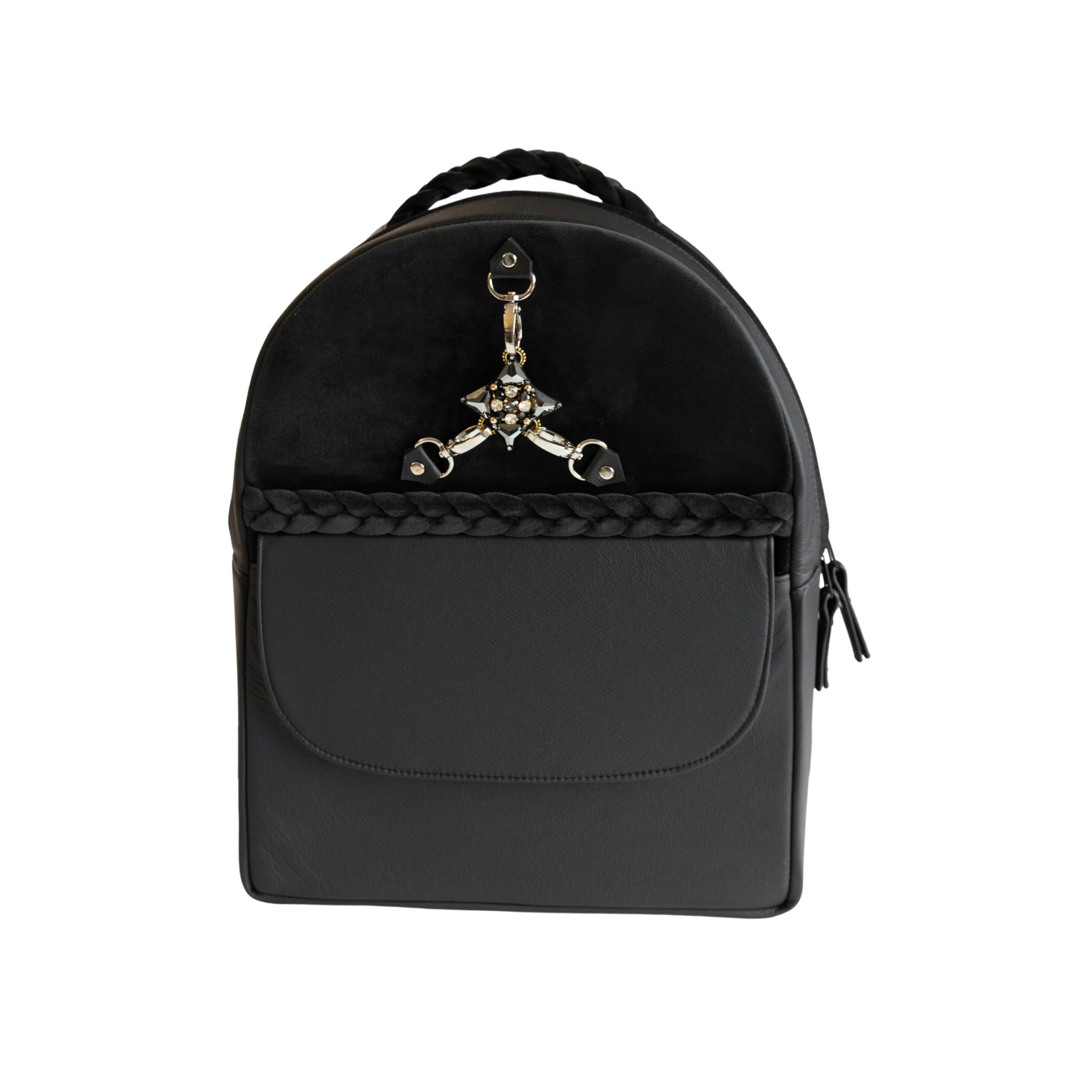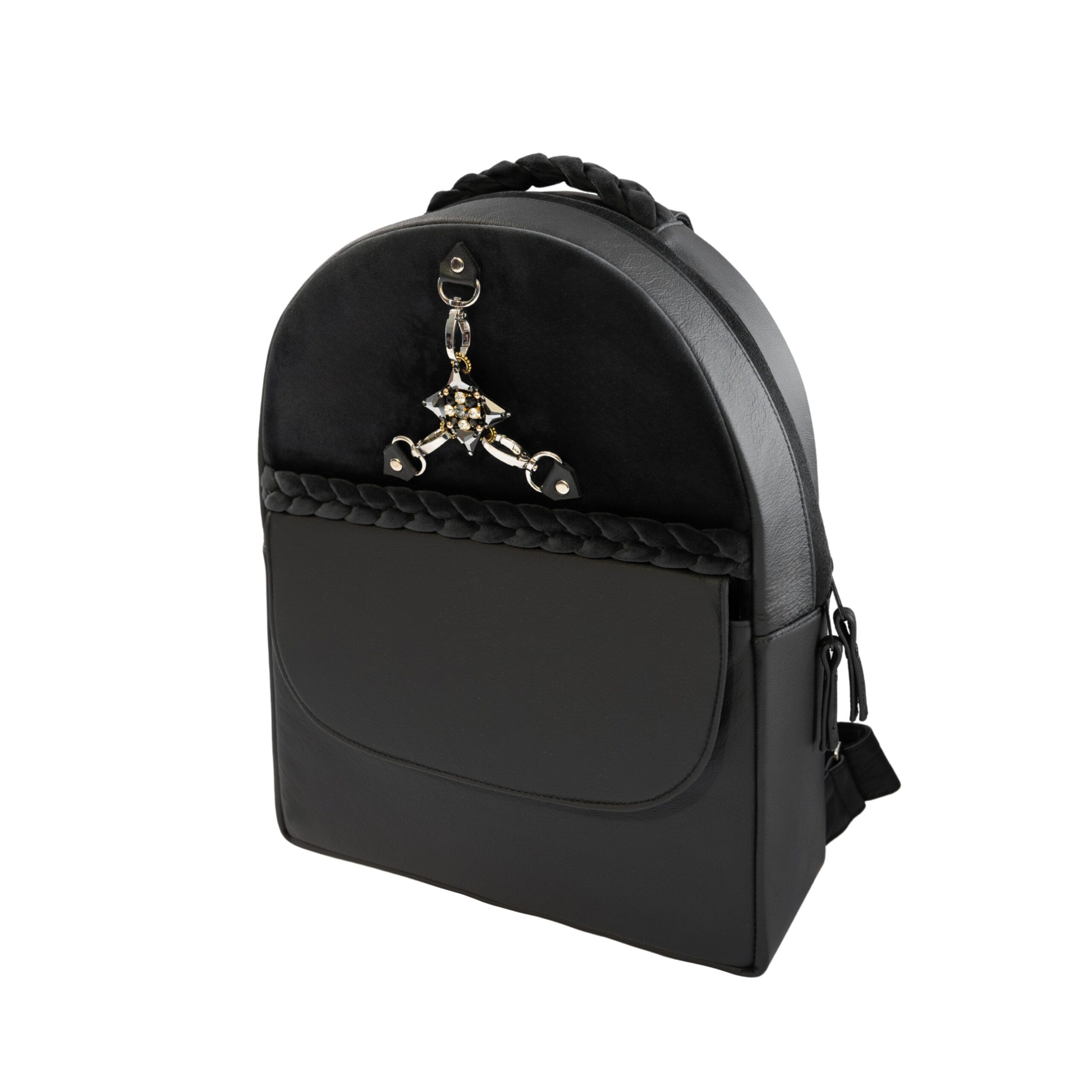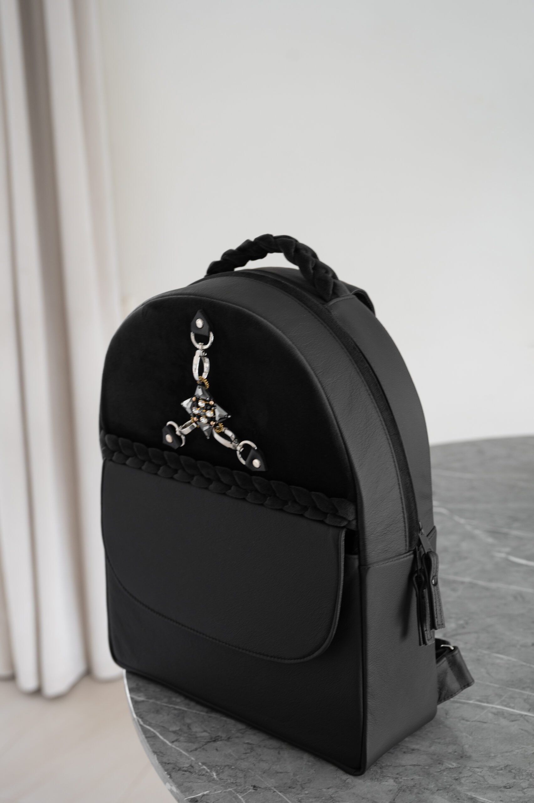 Juoda veganiška oda derinama su juodu aksominiu audiniu, kuris puošia kuprinės priekinę dalį.