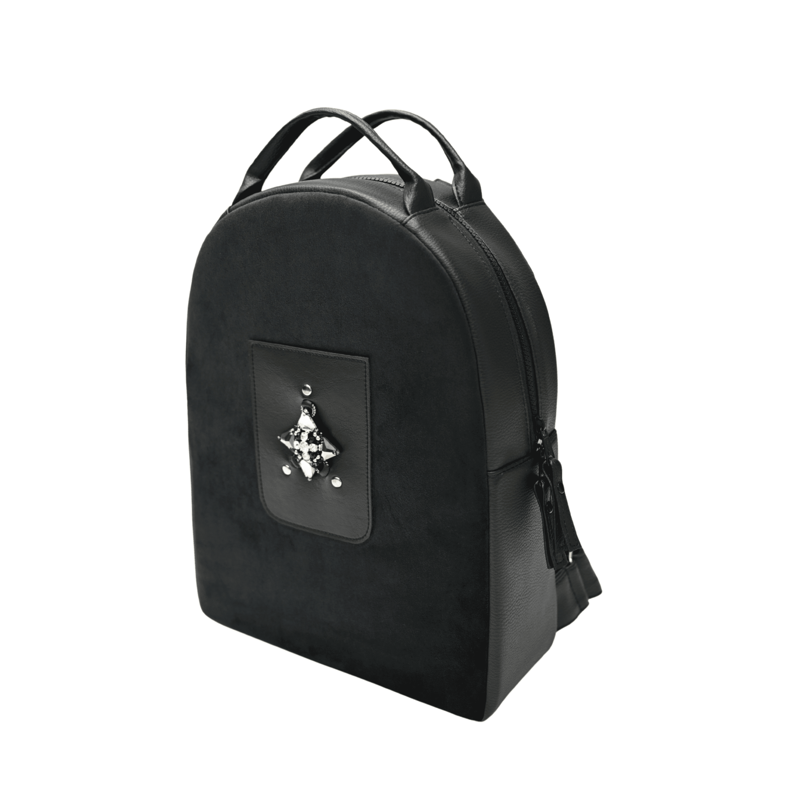 - Prabangus dizainas: Juoda veganiška oda derinama su juodu aksominiu audiniu, kuris puošia kuprinės priekinę dalį.