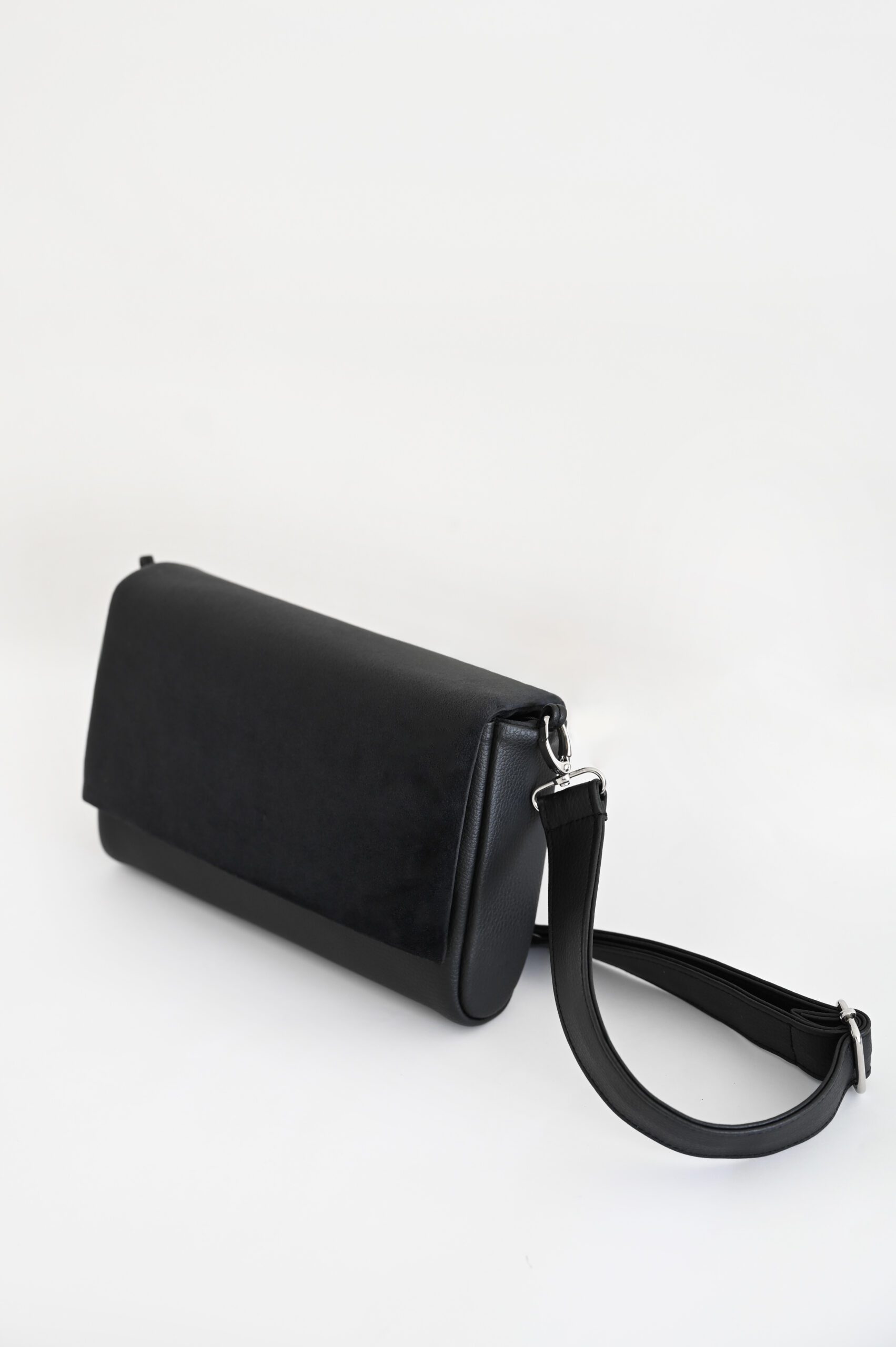 Prabangus dizainas: Juoda veganiškos odos rankinė su juodo aksominio audinio deriniu.