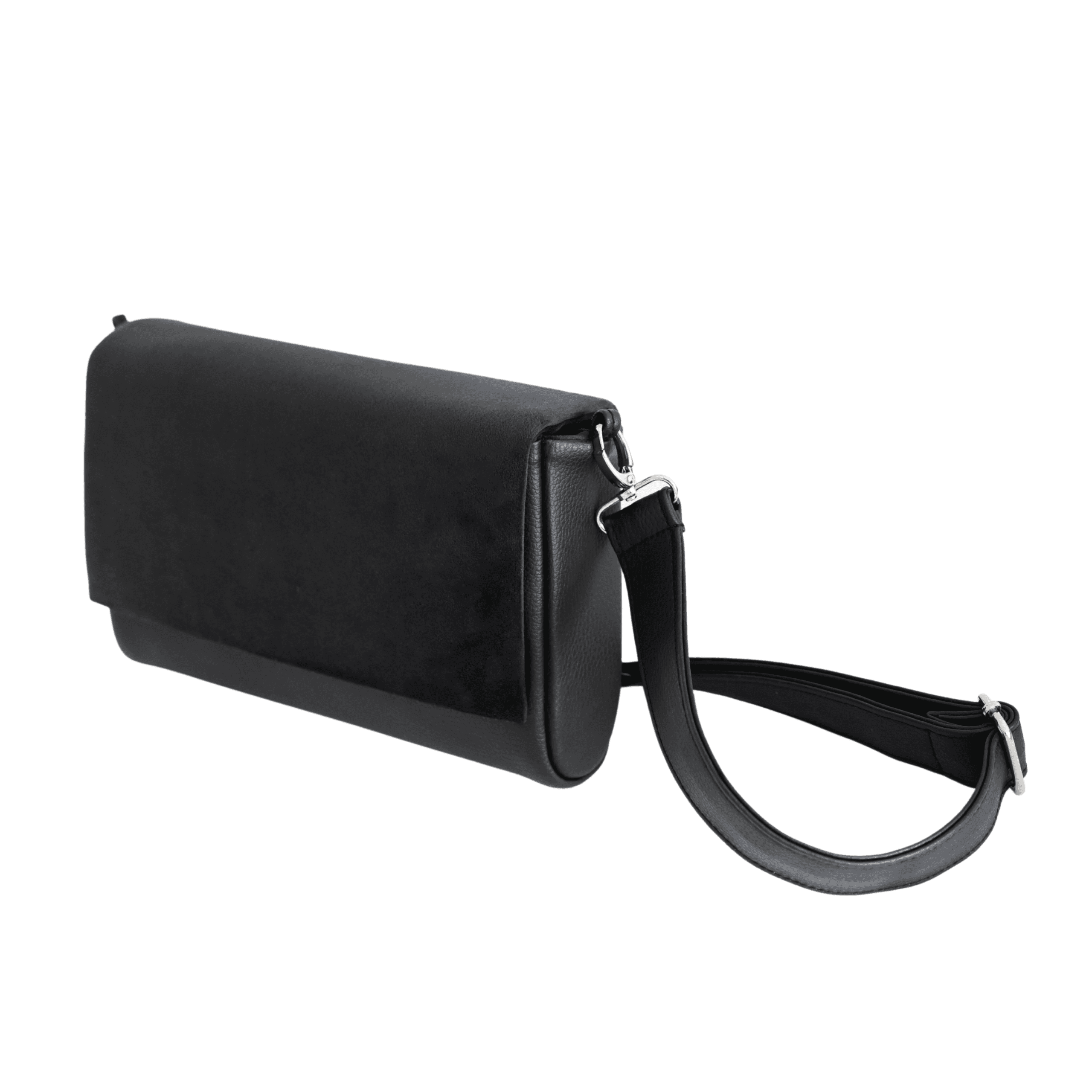 Prabangus dizainas: Juoda veganiškos odos rankinė su juodo aksominio audinio deriniu.